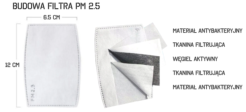 W filtrach PM 2.5 zastosowano system pięciowarstwowej filtracji, w tym warstwę z węgla aktywnego, który neutralizuje przykre zapachy. Tak zbudowany filtr zapobiega przenikaniu do płuc 99,9% pyłów, m.in. smogu, spalin, drobin pleśni czy kurzu, ale także bakterii, wirusów i innych drobnoustrojów.